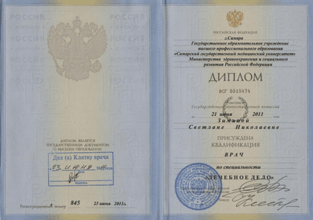 - Самарский государственный медицинский университет, специальность «Лечебное дело». 2005-2011г.