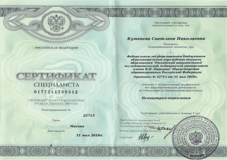 - Ординатура: ФГАОУ ВО РНИМУ им. Н.И. Пирогова. Специальность: психиатрия-наркология 2011-2013г.